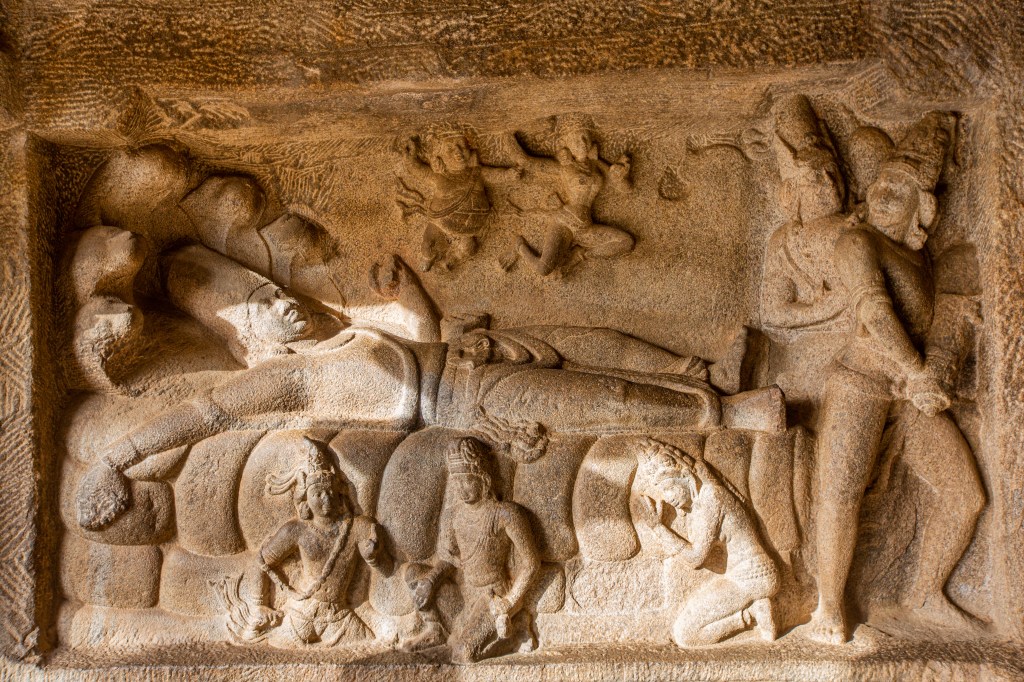 Intelligent Design?Vishnu Dreams the World. “… the Supreme reposes upon his mighty serpent couch amidst the deep … in this manner the mighty Visnu, whose essence is the elements, abides in all bodies, and brings about production, existence, and dissolution.” Seventh century A.D. cave temple of Mahisha Mardini Mandapa in Mahabalipuram, India. (xTOLIndia.com, Shutterstock)