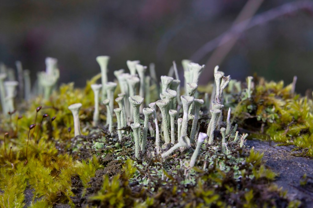 Trumpet cup lichen (Cladonia fimbriata). Lichen are actually symbiotic organisms from different biological kingdoms (fungi and bacteria) that integrated their complimentary traits and co-evolved.